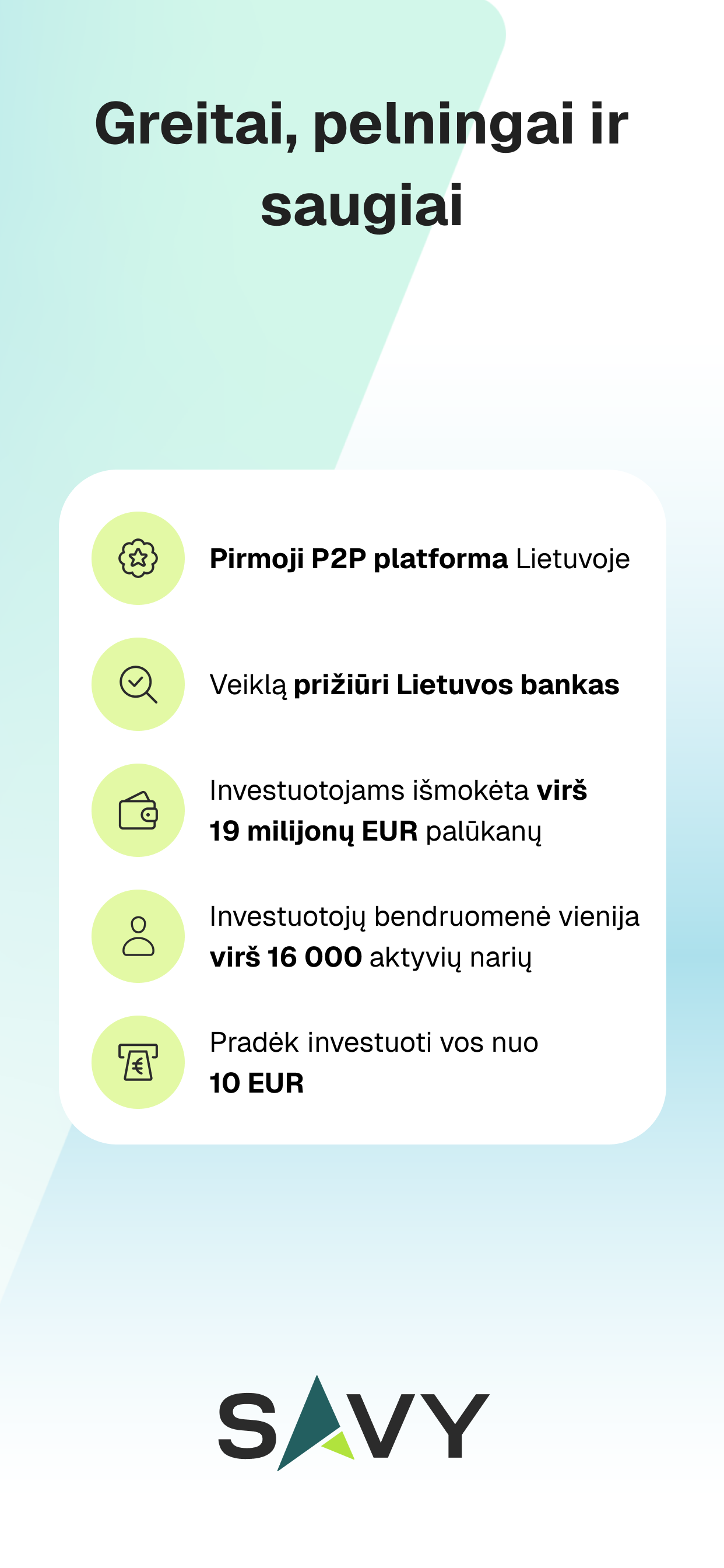 SAVY – investavimo ir finansavimo platforma, tarpusavio skolinimo kultūros Lietuvoje pradininkė. Esame atsakingi, mūsų veiklą prižiūri Lietuvos bankas, o veiklos tvarumą patvirtina daugkartiniai sparčiausiai augančių įmonių apdovanojimai „Gazelė“.