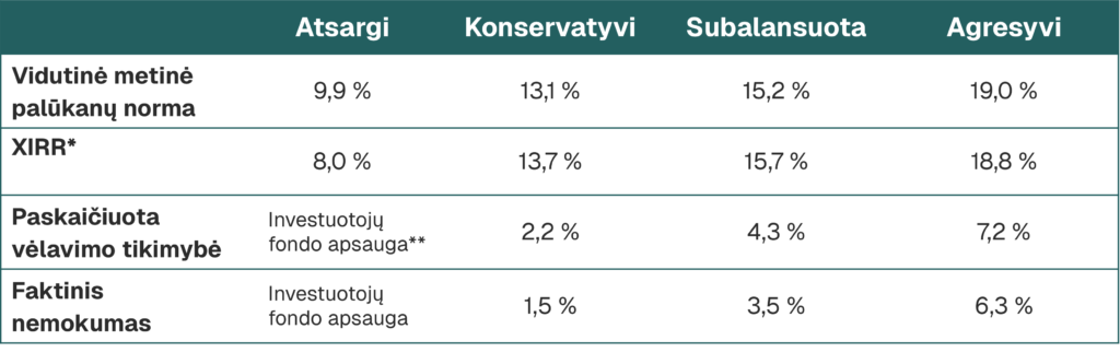 Linkusiems prisiimti didesnę investavimo riziką atitinkamai galima rinktis konservatyvią, subalansuotą arba agresyvią investavimo strategiją.